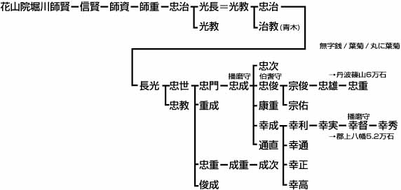 青山氏は、寛政重修諸家譜に「花山院堀川師賢(後醍醐天皇の忠臣)の子 信賢、その子 師資、其の嗣 師重、初めて青山と称す」とある。その後裔忠門のとき、近江国から三河国へ移り三河国額田郡百々村の城主となった。その忠門が松平広忠・徳川家に仕え、その子忠成は秀忠の守役を務めて徳川氏の創業に貢献した。 青山家は「葉菊」を定紋とした。南北朝時代、祖先が南朝に与して功があり、日月、菊紋の錦の御旗を賜ったという。そのとき、楠木家の旗紋もまた菊花であったことから、これと区別するために両葉を加えた。以後代々、家紋としたとされている。とはいえ、南北朝を扱った『太平記』や『梅松論』などに、日月の錦旗は活躍しても、菊文の錦旗というのはみえない。青山氏の葉菊紋のいわれも、そのままには受け取れないところが少なからずあるようだ。 忠成は早くから家康に近仕し、二十一歳の時に父忠門の後を継いだ。天正十三年、秀忠の傳となり、秀忠十一歳の時に上洛した際、随従して秀吉から従五位下常陸介に叙任された。関東入府後は武蔵国に五千石を受けている。慶長五年、関ヶ原の戦いには秀忠に従軍して遅参したものの、同年十一月には播磨守となり、翌年には上総国と下総国に併せて一万五千石を賜った。さらに江戸奉行・関東総奉行を兼任し、本多正信・内藤清成と並んで幕政に重きをなした。 秀忠治政のとき、仁の酒井雅楽頭、智の土井大炊頭とならんで勇の青山伯耆守として将軍秀忠を輔け、武蔵岩槻四万五千石を領した。しかし、元和九年(1623)忠俊は、三代将軍家光の勘気にふれ、領地は収公された。忠俊がなぜ勘気にふれたのか、その理由についての明確なものは記録として残っていない。 もっとも考えられるのは、当時の秀忠・家光の二元政治にその因を求められないか。すなわち、忠俊は秀忠から信頼の厚い側近であり、家光の若手側近グループからすれば、最初に排除されなければならない存在であった。また忠俊は、家光の補導役として強諌直言のこともあった。これらの結果、古い政治家となった忠俊は舞台から去らざるを得なかったのではないか。 寛永九年、秀忠が死ぬと、忠俊も自ら剃髪してかねて大徳寺の宗珀和尚から与えられていた法号道称を用いて、春室宗信と名乗った。しかし、秀忠の死は二元政治の終焉を意味し、同年江戸より「赦免」の手紙が届いた。これは、勘気が家光の個人的なものではなく、当時の政治状況によって起きたものであることを背面から語っているものだ。つまり、家光は忠俊の忠誠をわかっていながら、自己の権力の教化のためには秀忠派の忠俊を切り捨てざるを得なかったということだろう。 こうして、嫡子の宗俊は大名に返り咲き、その後青山家の家運は営々と栄え、その嫡流の多くが幕閣の重職についた。 ■参考略系図 |