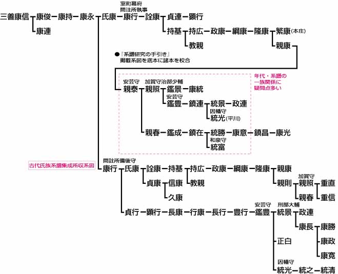 『問註所家譜』によると、「浄蔵貴所浄蔵(三善清行の子で布施・飯尾氏の祖で、康信系とは異なる)の後裔町野中宮太夫属散位従五位下三善朝臣康信入道善信云々、嫡子は問註所氏と称し、庶子は町野、或いは平川、或いは三善」とある。これによれば、三善一族の嫡流は町野氏であったが、称としてはむしろ問註所氏といったことがわかる。