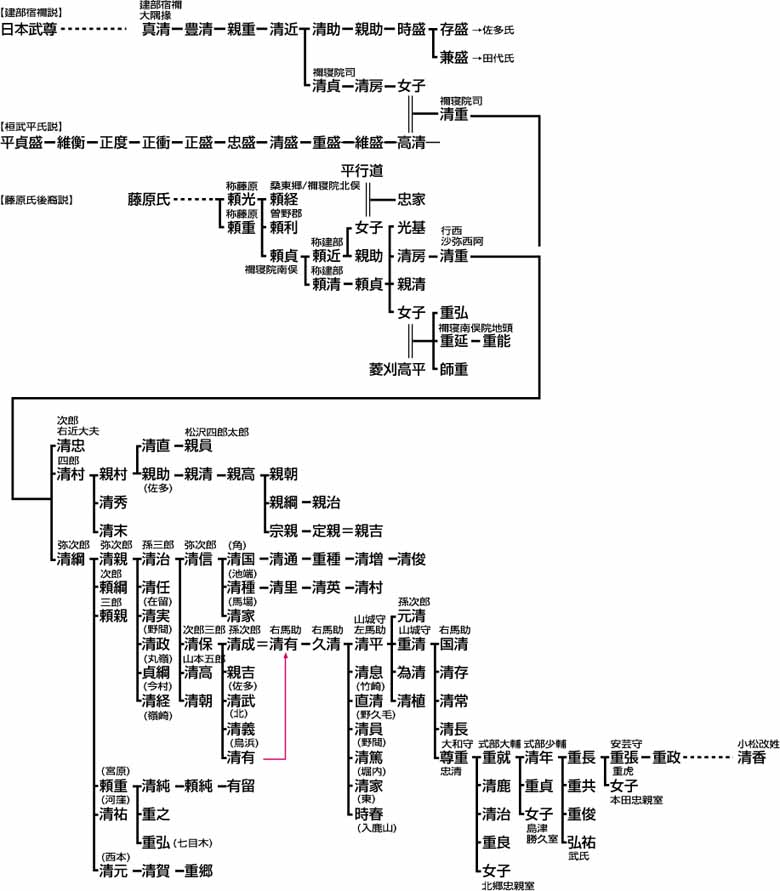 禰寝院に入った清重は名字を禰寝とし、建部清房の女を娶って本姓を建部とし、本姓平氏をはばかったとされる。ところで、清重の下向説には都合の悪い史料がある。すなわち、清重が大隅国に下ったとされる七年前の建久八年(1197)に作成された『大隅国建久図田帳』に、すでに清重の名が見い出されるのである。いずれにしても、禰寝氏の祖に関しては平氏としながらも、『禰寝文書』などからは藤原氏とも想定され、さらに、近江国の建部神社の神職であった建部氏の後裔とするものなど、さまざまな説が見い出せるのである。