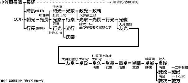 仁賀保氏は、甲斐源氏小笠原氏流の大井朝光の後裔と伝えられる。