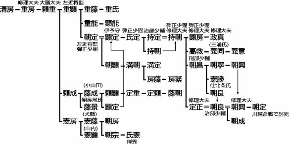 頼重には重顕・顕成・憲房らの子がいたが、長子重顕は「元弘の動乱(1333)」に尊氏・直義兄弟に従って活躍した。重顕の家督を継いだ朝定は、室町幕府の引付頭人として主に京都にあった。嫡子朝顕も京都八条に住み、幕府に仕えてその子孫は八条上杉氏といわれた。朝定の養子の顕定は、鎌倉扇谷に住んで鎌倉公方に仕え、扇谷上杉氏の祖となったのである。