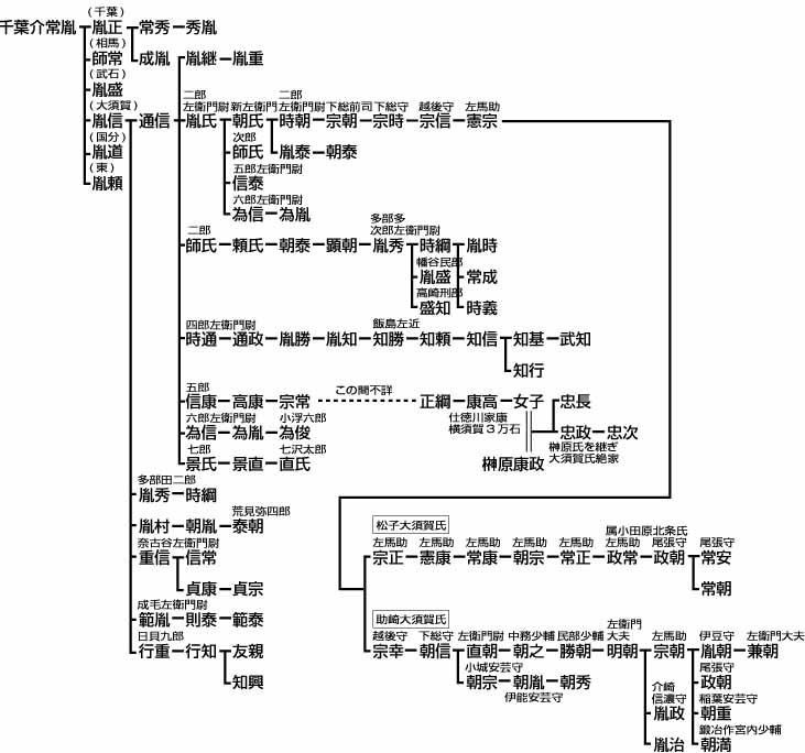 大須賀氏は、千葉介常胤の四男四郎胤信を祖とししている。『千葉大系図』や『大須賀家系図』などによれば、胤信は左衛門尉を称して、香取郡大須賀保を所領とし、胤信の嫡子通信の代に保内の松子城に住したとみえている。そして、その庶子からは、田部多・荒見・奈古谷・成毛らが分かれ出た。 大須賀氏の登場 千葉常胤は源頼朝の旗揚げのときから頼朝に従って、幕府草業の功臣として頼朝から厚い信頼を得た。千葉氏は嫡男の胤正が継承し、二男師常は相馬御厨を本拠として相馬氏を称し、三男の胤盛は武石郷を領して武石氏を、五男の胤道は葛飾郡国分郷を領して国分氏を、六男胤頼は香取郡東庄を領して東氏を、そして、四男四郎胤信が大須賀保に入部して大須賀氏を称したのであった。この六家を併せて、のちに「千葉六党」と称される武士団となった。 胤信は頼朝の側近くに仕えて、厚い信頼を受けた。建久元年(1190)九月、頼朝の上洛の奉行人が決められたとき、胤信は八田知家とともに厩の事をつかさどる奉行となった。このときの奉行人の顔ぶれを見ると、和田義盛・梶原景時・三浦義連・葛西清重・大江広元などの錚々たるメンバーで、胤信はこれらの有力御家人と肩を並べて、重要な役割を勤めたのであった。胤信が頼朝からあつい信頼を受けていたのみならず、その行政能力も高かったことを示したものといえよう。 その後、鎌倉幕府内では、執権北条氏の権勢が著しく伸張し、他の鎌倉御家人との間で勢力争いが起った。北条氏は対立する御家人を次々と没落させ、権勢を確立していった。大須賀氏は北条氏と近い関係を築き上げ、鎌倉末期まで下総に勢力を維持した。 大須賀氏の興亡 やがて、元弘の乱において鎌倉幕府が滅亡すると、建武の新政が発足し、建武政権は北畠顕家を陸奥守に任命して奥州に下向させ、顕家は義良親王を奉じ陸奥国府の置かれた多賀城において、奥州の支配を開始したのである。 このような情勢のなか、大須賀氏の奥州における所領は、南朝方の中心的武将であった結城白河氏に与えられてしまった。大須賀氏の所領が没収されたのは、大須賀氏が鎌倉幕府や執権北条氏に近い存在であったことが原因となったようだ。その結果、大須賀氏は南朝方に対抗する意味もあって、北朝方として活躍した。とくに奥州大須賀氏は建武四年(1337)、石川松河四郎太郎を大将とする北朝軍に属して、南朝方の小山権守の菊田庄滝尻城、湯本館を攻撃した。その後、奥州大須賀氏は岩城氏に属して戦国時代に至ったようだ。 一方、下総の大須賀憲宗は千葉介貞胤とともに足利尊氏と対立したが、間もなく足利方に降伏して家名を守った。憲宗の子宗正は、貞治四年(1365)に千葉介満胤が家督を相続したときまだ幼少であったため鎌倉公方足利氏満の命を受け、その後見人となったことが知られる。 南北朝の内乱は、足利義満によって南北合一が成り一応の終結をみせ、関東の政治体制は関東府を頂点として成立したが、十五世紀になると、関東府を中心として戦乱が起こるようになった。足利持氏が公方になると、「禅秀の乱」が起り、大須賀憲康は千葉本宗家の満胤・兼胤父子とともに禅秀方に属していたが、のちに持氏方に転じて所領を安堵されたようだ。その後、持氏と幕府の対立から「永享の乱」が起り、持氏は幕府軍に敗れて滅亡した。この永享の乱に際して、大須賀一族がどのような行動を取ったかは分からない。 その後、持氏唯一の遺児である永寿王丸(成氏)が許されて関東公方となり、関東府が再興された。しかし、新公方となった成氏は上杉氏と対立し、さらには幕府とも対立するようになり「享徳の乱」を引き起こした。この享徳の乱によって関東は戦乱の坩堝となり、時代は戦国へと移行していくことになるのである。 二つの大須賀氏 ところで、大須賀氏は松子城を本拠とし、助崎城を支城として中世を生き抜き、松子大須賀氏を本宗家とした一つの勢力として存在していたと考えられていた。ところが、戦国時代の天正十一年(1582)から翌十一年にかけて作成されたと考えられる「小田原一手役書立写」に「大須賀殿 助崎殿」とみえているのである。このことから大須賀氏は松子と助崎がそれぞれ別個の領主として存在していたと思われるのである。 大須賀氏の系図として「大須賀家蔵大須賀系図」と「宝応寺蔵大須賀氏系図」が知られる。そして、「大須賀家蔵大須賀系図」から助崎大須賀氏の系譜が知られるのである。二つの系図から、大須賀氏が二流に分かれたのは、憲宗の子の代と考えられる。 松子城を本拠とした大須賀氏は次第に有力国人領主として千葉宗家から独立する傾向を示すようになり、助崎大須賀氏は千葉宗家を支えて時代の変転に対応していた。 戦国時代になると、小田原城を本拠とした後北条氏の勢力が関東一円を席巻するようになり、千葉宗家も後北条氏の麾下に属するようになり、大須賀氏も後北条氏に属するようになった。しかし、