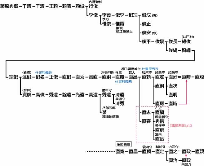 藤原秀郷は一説に近江国栗太郡田原郷から出たというように近江と縁があり、近江北部には秀郷の後裔を称する武士が多い。