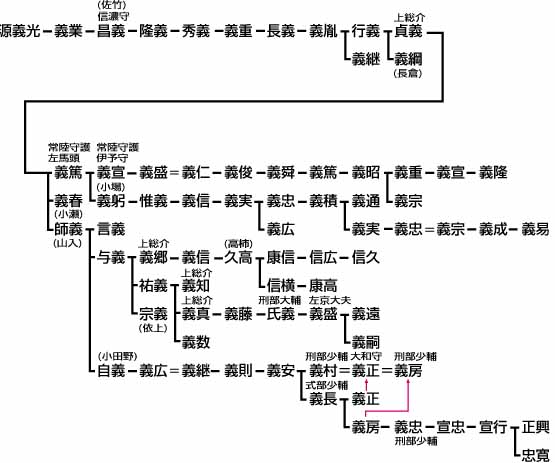 小田野氏は常陸源氏佐竹氏の一族山入氏の庶家である。常陸国那珂郡美和村小田野に城を築いてそこに拠った。『新編常陸国誌』には「佐竹の末葉小田野刑部少輔行義の居りし所と云う。中世佐竹氏の族、此処に住して小田野氏となる。其の館の址、今、山林となって存せり」とかかれ、『日本城郭全集』では「十四世紀中頃、佐竹貞義の七男山入師義の三男自義が、当城(小田野城)を築き、小田野九郎と称し、九代二百五十年間の城である」と記されている。 佐竹氏の擾乱 小田野自義は、山入氏の庶子家であったが、山入一揆騒動のときは、佐竹宗家側について、忠節をつくした。その功績により、のちに久慈郡小川郷その他の領地を佐竹宗家より得て、永く繁栄した。 山入師義は、足利尊氏に属して常に身近に侍し、各地で戦功をたてた功績により、尊氏から直接国安郷を与えられた。これにより、山入氏は佐竹一門の中でも他の庶子家と違って、佐竹惣領と肩を並べるような勢を示していた。応永十四年(1407)佐竹十二代義盛が死去すると、義盛には男子がなかたことから、後継問題で佐竹家は二つに分かれて対立抗争した。 一つは、関東管領上杉家から義人を養子に迎えようとする惣領派、一つは、源氏の血をつなぎ惣領襲を得ようとする山入師義を急先鋒とする山入派であった。この対立は、関東公方や関東管領の勢力争いとも結び、以後、百年間も不毛の争いが繰り返された。これが「山入一揆」の起こりである。当時は、室町幕府の力も弱まり、京都では応仁の乱が起こり、各地では土一揆が発生、世はまさに戦国時代に入ろうとしていた。そして、下剋上の風潮が起こり、それらのことが、常陸国では山入一揆となってあらわれたのである。 さて、佐竹十六代義舜が父義治の死後、十六歳で家督を継いだとき、山入氏義は義舜を太田城より追放し、以後、十四年間にわたって太田城主にあった。一方野義舜は文亀二年(1502)一月、金砂山の合戦に勝利して以来勢を養い、永正元年(1504)に太田城奪還の総攻撃に出た。山入氏義は、この太田城攻防戦に敗れて難攻不落の山城である本拠地の国安城に退き籠城した。 しかし、戦勢に勝運はなく、山入一族は佐竹領外へ出ようと久慈川を北に逃れたが、途中の高部で、小田野大和守義村の二男義正に捕えられ、茂木の覚明院境内で山入氏義・義盛父子は殺害された。氏義らの墓は小田野氏のはからいによって、小川の長福寺に残っている。 宗家の家臣に列す 戦国時代、小田野氏の惣領義正は佐竹義昭の側近の重臣で、天文後半から永禄前半の間に、宇都宮広綱・芳賀高継から義昭への披露を依頼した書状を送られたり、白河晴綱へ書状を送ったりしている。さらに、義昭の使者として陸奥南郷の指南にあたっていた東義堅の所へ赴くなどの務めを果たしている。弘治三年(1557)には、和田昭為とともに、義昭側近の筆頭として、甲神社に百疋を奉加したことが「甲神社文書」から知られる。 義正のあとは、弟で僧籍にあった義房が還俗して継いだ。義房は佐竹義昭・義重の二代に側近の重臣として仕えた。義房の子義忠は、義重・義宣の二代に仕え、ことに義重の時代には、和田・小貫氏らとともに佐竹家中屈指の側近重臣で、天正初年頃から、芳賀高継・岩城常隆・白土隆貞らから、佐竹氏に披露を依頼する書状を送られている。また、伊達政宗に書状を発給したりしている。天正九年(1581)十二月には、上野新田で戦功をあげ、佐竹義重から刑部少輔という官途を与えられた。 天正十八年、豊臣秀吉による小田原北条氏攻めが起ると、佐竹義宣は小田原に馳せ参じて所領安堵を受けた。以降、小田野氏の佐竹家重臣としての地位は多少低下したようだが、それでも文禄四年(1595)には、義宣から久慈郡深萩の蔵入地千百七十三石余を預け置かれる有力者であった。豊臣秀吉の朝鮮出兵のとき、義宣に仕えて肥前名護屋に在陣した。 慶長七年(1602)、佐竹氏が常陸から秋田大舘への転封とに際し、小田野義忠は子宣忠とともに秋田に移った。こうして、常陸における二百五十年にわたった小田野氏の歴史は幕を閉じた。 ■参考略系図 |
