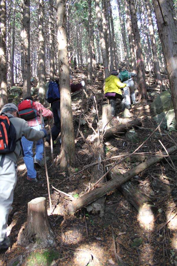 薄らとだが道らしきものが見える。まず小さな丘を越え、その先の道なき山に取りつき急斜面を激登りする。出曲輪を思わせる尾根先の平坦地を過ぎ、水場であろうか斜面の窪地を見下ろし、さらに城跡めざして急斜面をひた登っていく。