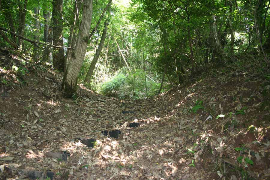 城址へは東南の山裾にある鹿島神社と、その隣の岩中発電所の間から舗装された登り道が続いている(一般車は利用できない)。一度目の訪問時には登城路が分からなかったこともあり、二度目は宵田城北方にある但馬国府・国分寺館を訪ね、学芸員の方より縄張図をいただき山上を目指した。舗装路の途中に旧道の標識があり、迷わず、旧道へと分け入った。曲輪、竪堀が連続するものの、