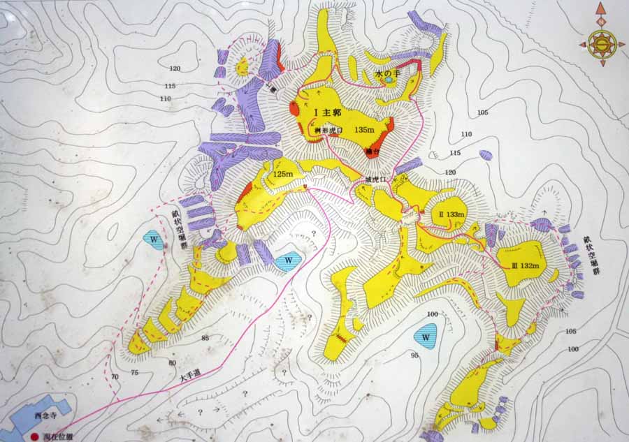 ・鹿背山城址縄張図(西念寺山門横の案内板より)
